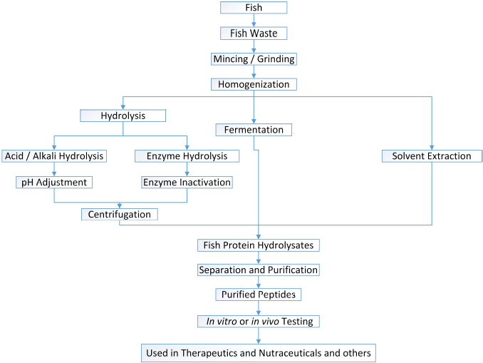 Numerous studies have been made to develop fish waste and underutilized fish to formulate, synthesize, and to produce commercially profitable products such as fish oil, enzymes, cosmetics, packing materials etc. [2]. Fish protein hydrolysates (FPH) can directly be used in nutraceuticals or can be processed and fractionated to be employed in pharmaceutical industries for therapeutic usage [3,4]. FPH is a concentrated and purified form of protein obtained by cleaving molecular bonds present in them by employing the processes of chemical or enzymatic hydrolysis; fermentation, solvent extraction methods, and various others [5].