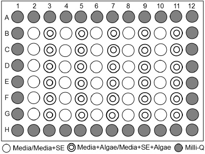 ![]() | Figure 1: Microplate’s border wells were filled with Milli-Q water up to 200 μl. The third column (blank) had 195 μl of media + 5 μl of SE, whereas the fourth column had 175 μl of media + 5 μl of SE + 20 μl of microalgae. [Click here to view] |