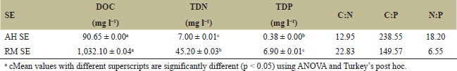 The soil samples were treated with aqueous extraction. Water was used as the solvent to prepare the SEs [17] because it is a chemical substance that dissolves a wide range of materials better than any other liquid. Around 20 g of each soil sample was mixed with Milli-Q water (ultrapure water) at a 1:10 ratio and autoclaved at 105°C for 1 hour, followed by centrifugation at 700 × g for 15 minutes (Allegra-30R Centrifuge, Beckman, Indiana, United States). A 0.7 m glass fibre filter (GF/F, Whatman) was used to filter the supernatant (about 150 ml) of SE. Each soil’s filtered samples were stored at 4°C for further use. Chemical analysis of AH and RM SE filtrates was performed. The MD600/MaxiDirect photometer system was used to measure total dissolved nitrogen (TDN) and total dissolved phosphorus (TDP) (Lovibond Tintometer, Amesbury, United Kingdom). The nitrogen and phosphorus levels were determined in mg l−1 using TDN and TDP of AH and RM SE filtrates, according to the instruction manual. The dissolved organic carbon (DOC) of each SE filtrate was analyzed using Total Organic Carbon Analyser (TOC)-L CSH (Shimadzu, Kyoto, Japan).