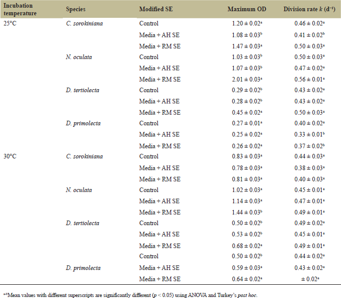 ![]() | Table 2: Effect of different incubation temperatures and modified SEs on the maximum OD and division rate of C. sorokiniana, N. oculata, D. tertiolecta, and D. primolecta. [Click here to view] |