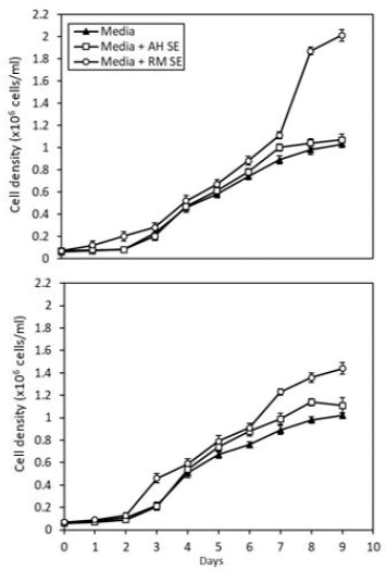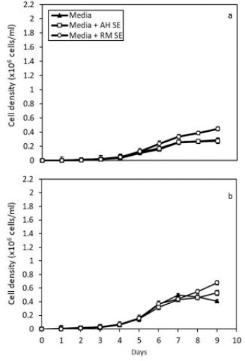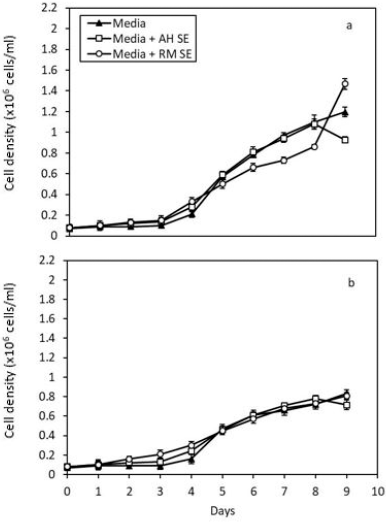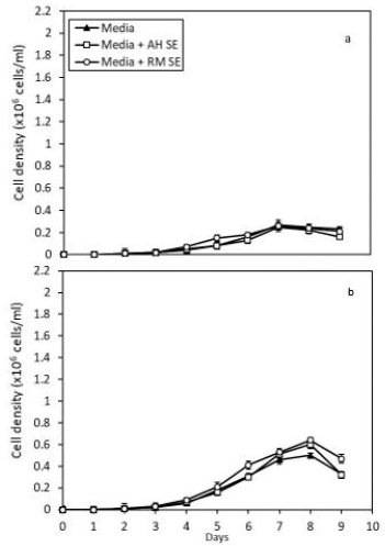 ![]() | Figure 3: OD at 680 nm of the N. oculata in media, media + AH SE, and media + RM SE at 25°C (a) and 30°C (b). Error bars represent standard deviation (n = 6). Mean values are significantly different (p < 0.05) using ANOVA. [Click here to view] |