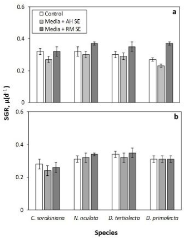 ![]() | Figure 6: SGR, μ of C. sorokiniana, N. oculata, D. tertiolecta, and D. primolecta on media, media + AH SE, and media + RM SE at 25°C (a) and 30°C (b). Error bars represent standard deviation (n = 6). Mean values are significantly different (p < 0.05) using ANOVA. [Click here to view] |