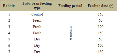 New Zealand male rabbits (Oryctolagus cuniculus), 6 months old, were used in this study. Rabbits were grown and treated in the laboratories of the Faculty of Science, Tanta University, according to the regulations and rules of scientific ethical research with license no. IACUC-SCI-TU-0126. Rabbits were fed fresh and dry beans as a supplemented diet in different quantities for a period of 6 months, as shown in Table 1. Control rabbits were fed a normal diet without faba bean. After the feeding period, blood samples were collected from the ear vein, after sterilization with 70% ethyl alcohol. Blood samples were drawn using a medical syringe and collected in separate tubes. Rabbits were sacrificed and their livers were collected and stored for further work.