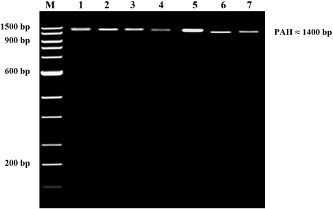 PAH gene fragments (≈1,400 bp) were amplified and cleared on agarose gel (Fig. 2). PAH genes of control and the six faba bean-fed rabbits were sequenced and aligned with the reference gene (accession number 013672).
