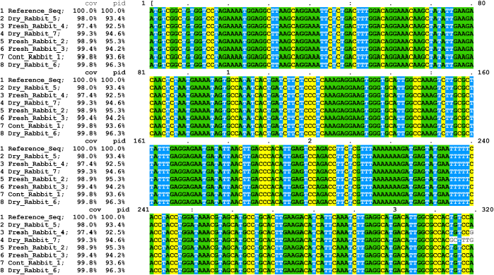 ![]() | Figure 3: Nucleotide sequence alignment of N-terminal (320 bp) PAH gene fragment amplified from control and six rabbit samples with the reference sequence (accession number 013672) in the GenBank. [Click here to view] |