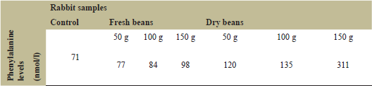 Phenylalanine content was estimated in rabbits’ blood to evaluate the effect of the faba bean-feeding diet. Data presented are the average of three replicates of rabbit samples. Generally, a positive correlation was found between faba bean dose and phenylalanine levels in the blood. As shown in Figure 1 and Table 3, rabbits fed a high dose (150 g) of dry bean showed the greatest increase in phenylalanine level (311 nmol/l), whereas rabbits fed a low dose (50 g) showed a low level of phenylalanine (120 nmol/l). Similarly, rabbits fed a high dose (150 g) of fresh faba bean had high levels of phenylalanine (98 nmol/l), whereas rabbits fed a low dose (50 g) had low levels of phenylalanine (77 nmol/).