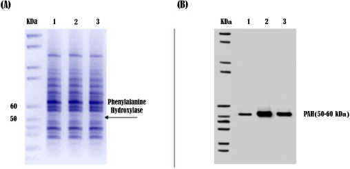 ![]() | Figure 4: Electrophoretic protein patterns (A) and PAH Western blot (B) for three rabbit samples. 1: control, 2: rabbit fed 150 g of dry beans, and 3: rabbit fed 150 g of fresh beans. [Click here to view] |