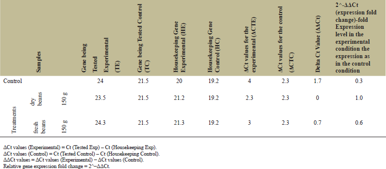 Quantitative RT-qPCR was used to evaluate the effect of feeding by fresh and dry faba bean on PAH gene expression levels. As shown in Table 5, rabbits fed 150 g of dry faba bean reflected a superior increase in gene expression level, almost threefold, compared with those fed 150 g of fresh faba bean which increased gene expression level with twofold the gene expression of control. Our findings indicated overexpression of the PAH gene as a direct influence of feeding on dry faba beans.