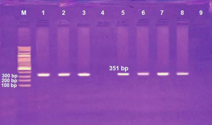 ![]() | Figure 1: Agarose gel electrophoresis of H. influenzae omp6 gene detection. Lane M: marker with 100 bp ladder and lanes 1–3 and 5–8: positive for omp6 gene, while lanes 4 and 9: negative for omp6 gene. Amplicon size: 351 bp. [Click here to view] |