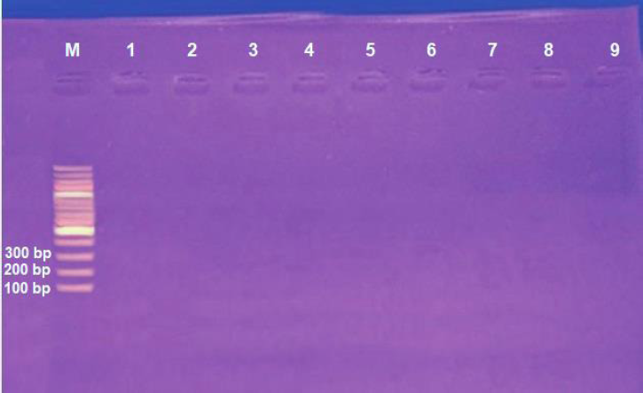 ![]() | Figure 2: Agarose gel electrophoresis of H. influenzae bexA gene detection. Lane M: marker with 100 bp ladder and lanes 1–9: negative for bexA gene. [Click here to view] |