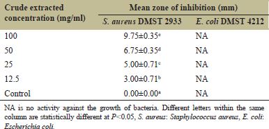 The crude extract of pandan prop root was evaluated for the antibacterial ability of S. aureus DMST 2933 and E. coli DMST 4212 using the disc diffusion assay method as described above. Results of crude extract at different concentrations on antibacterial activity are shown in Table 2. Crude extract of pandan prop root inhibited the growth of S. aureus DMST 2933 in all concentrations (12.5–100 mg/ml), with the highest mean zone of inhibition at 9.75 ± 0.35 mm using 100 mg/ml of crude extract. However, the pandan prop root crude extract showed no in vitro activity against E. coli DMST 4212, concurring with Dumaoal et al. [19], who reported that pandan leaf crude extract had activity against the growth of S. aureus ATCC 25923 but not against the growth of E. coli ATCC 25922. Pandan leaf and root contain phytochemicals as bioactive compounds and essential oil that inhibit the growth of some pathogenic bacteria [8,19]. Mar et al. [26] found 54 compounds in essential oil from pandan leaves that inhibited the growth of various Gram-positive and Gram-negative bacteria, including S. aureus, a common cause of minor skin infections, mainly when introduced into a wound or skin incision. From our knowledge, most of the previous findings focused on the antibacterial activity of pandan leaves. However, the study concurring with pandan prop root is scarce. Then, this study is the first report for evaluating the antibacterial activity of pandan prop root crude extract, which showed the potential for application as an ingredient for skin cosmetic and pharmaceutical products.