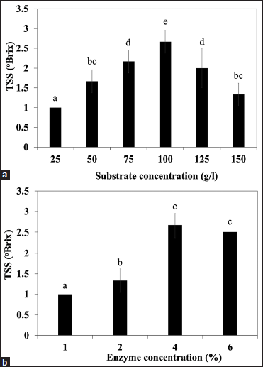 ![]() | Figure 2: Effects of substrate (a) and enzyme (b) concentrations on total soluble solids (TSS) content from hydrolysis of pandan prop root powder by iKnowZyme® cellulase. [Click here to view] |