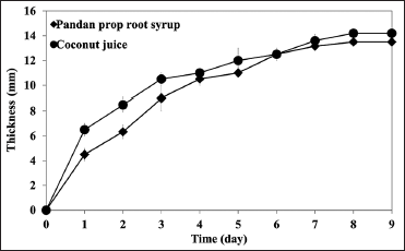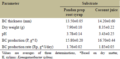 ![]() | Table 3: Bacterial cellulose (BC) production parameters from pandan prop root syrup and coconut juice by K. xylinus AGR 60. [Click here to view] |