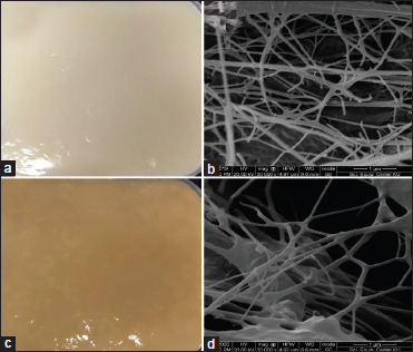 ![]() | Figure 4: Photographs and scanning electron micrographs of bacterial cellulose produced from coconut juice (a and b) and pandan prop root syrup (c and d) by fermentation of Komagataeibacter xylinus AGR 60 at room temperature for 9 days. [Click here to view] |