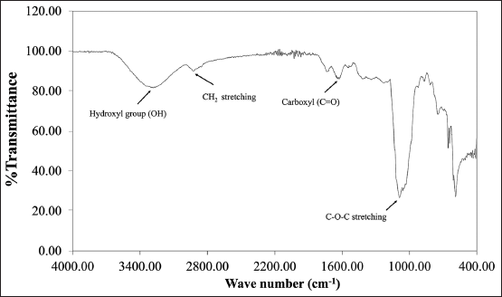 ![]() | Figure 5: Fourier-transform infrared spectra of the pandan prop root bacterial cellulose at wavenumbers 4000–400 cm-1. [Click here to view] |