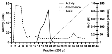 For purification, the crude extract was subjected to cation exchange chromatography [Figure 1], which allowed the removal of contaminants and unwanted proteins from the extract. The most active fractions on PGA (15–19) were subjected to a column of hydrophobic interactions, and in this case, the activity was detected in the fractions (1–12) that did not interact with the matrix [Figure 2]. This purification step improved the specific activity by 2.5 fold than that determined in the crude extract [Table 1] and allowed the removal of proteins with cellulase and xylanase activities (data not shown). Finally, the recovered proteins were separated by molecular exclusion on a Superdex 75 pg column. The activity analysis on PGA of the fractions indicates that the active fractions (67–70) correspond to a well-defined protein peak [Figure 3]. The purified polygalacturonase presented a specific activity of 1268 U/mg, which represents 3.2 fold of the specific activity determined in the crude extract and a recovery percentage of 1.2% [Table 1]. According to the analysis by SDS-PAGE, the purified polygalacturonase has a molecular mass of 37 kDa [Figure 4], and as shown in the zymogram, the enzyme is active on PGA.