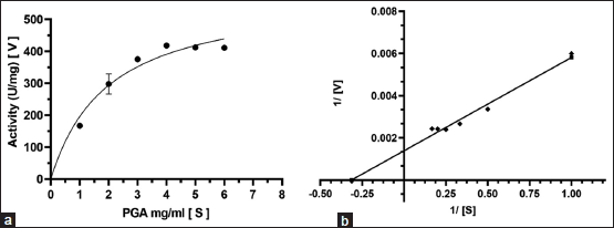 Regarding metal ions effect on enzymatic activity, the results indicated that Mg2+ decreases the activity of the purified polygalacturonase from 1 mM; the activity slowly decays as its concentration increases. The enzyme was rapidly inhibited by Mn2+ and Ca2+. EDTA had a negative effect on activity similar to that of Mg2+ [Figure 6b]. According to the Lineweaver-Burk plot, the purified enzyme has Km and Vmax values of 3.18 mg/ml and 716.15 U/mg, respectively, using PGA as substrate [Figure 7].