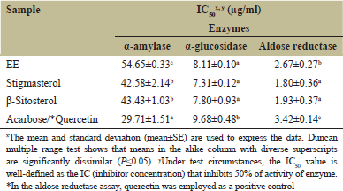 ![]() | Table 1: Inhibitory potential of EE, C1 and C2 against α–amylase, α–glucosidase, and aldose reductase enzymes. [Click here to view] |