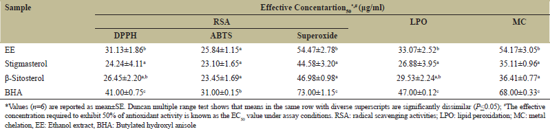 EE and its derivatives showed a similar trend in radical scavenging activity testing. Table 2 summarises the estimated half effective concentration, or EC50 (g of testing per ml), of EE and associated components. In all three antioxidant experiments examined, stigmasterol had considerable free radical scavenging activities, but C2 was relatively lesser (in terms of EC50 values) compared to C1 (P < 0.05). In all in vitro antioxidant studies, EE and compounds extracted from them excelled BHA, and the activity ascended in the order C1>C2>EE>BHA.