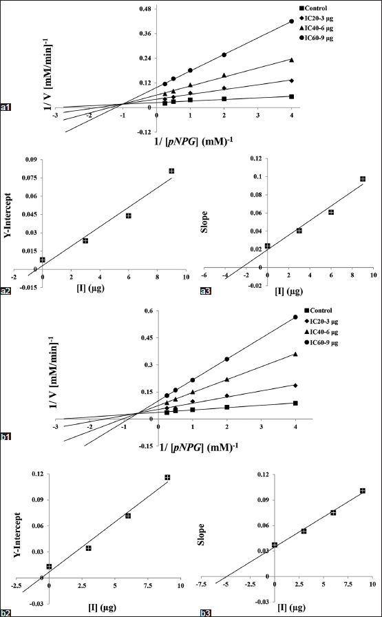 ![]() | Figure 1: Lineweaver-Burk plot (LBp) on inhibition of α-glucosidase activity by Stigmasterol (a1) and β-Sitosterol (b1) at diverse concentrations for the estimation of K1 and K2. (a2, a3 and b2, b3) curve represents K1 and K2 calculation for the pNPG substrate, respectively. [Click here to view] |