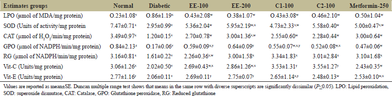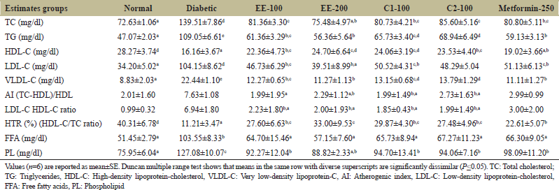 ![]() | Table 3: After 28 days of treatment, the effect of EE, C1 and C2 on the serum lipid profile of experimental normal and diabetic rats. [Click here to view] |
