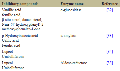 ![]() | Table 8: Antidiabetic enzyme inhibition activities of the previously reported phytocompounds from banana plant [Click here to view] |