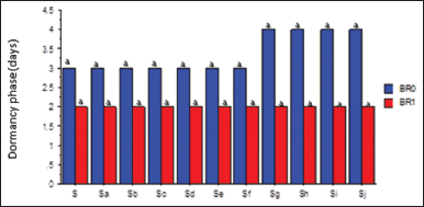 Although salinity and BR had no significant effect on the dormancy phase (DP), BR application reduced the number of days to first sprout compared with no BR application. Conversely, higher salt concentration (10.94–15.63 dSm−1) increased the DP of the seeds [Figure 1]. It also reduced the FGR significantly relative to the control (S = 0.00 dSm−1). The highest FGR was obtained in Sa (1.56 dSm−1), while the lowest was obtained in Sj (15.63 dSm−1) salt concentration [Figure 2a]. However, the FGR was significantly (P ≤ 0.05) enhanced by BR application [Figure 2b]. The interaction between salinity and BR showed that FGR was statistically at par with BR application irrespective of the salt concentration [Figure 2c].