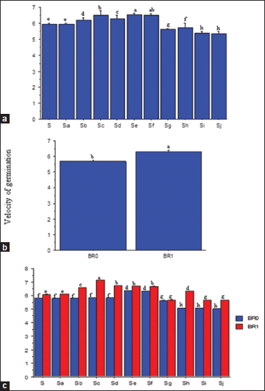![]() | Figure 4: Salinity rates (a), brassinolide effecta (b) and SR × BR interactions (c) on velocity germination of soybean seeds. SR: Salinity rate; BR=Brassinolide; BR0=No BR application (0 mL): BR1 = 0.5 mL: S = 0.00 dSm-1 (control); Sa = 1.56 dSm-1; Sb = 3.13 dSm-1; Sc = 4.69 dSm-1; Sd = 6.25 dSm-1; Se = 7.81 dSm-1; Sf = 938 dSm-1; Sg = 10.94 dSm-1; Sh = 12.50 dSm-1; Si = l4.06 dSm-1; Sj = 15.63 dSm-1. Mean pairs with different letter are significantly different at the 5% probability level according to Duncan’s’ New Multiple Range test. [Click here to view] |