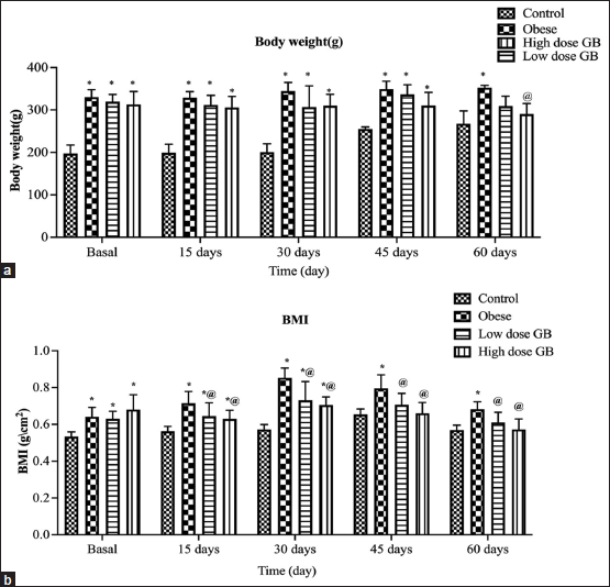 Figure 1 depicts the time-dependent alterations in b.w. and BMI in the four groups throughout 2, 4, 6, and 8 weeks. At the start of GB extract supplementation, there was a significant increase in b.w. and BMI in obese, low dose of GB (200 mg/kg b.w), and high dose (400 mg/kg b.w) of GB rats compared to the normal control group. In the 4–8 weeks period marked by observation of the opposite, there was a significant decrease in BMI of low dose of GB and high dose of GB rats compared to obese rats. Figure 2 shows the advanced changes in naso-anal length and waist in the four groups over the 2, 4, 6, and 8 weeks. This means that the BMI of the two GB administrated groups (low and high dose of GB) showed decreases in BMI values after cessation of the experiment (after 8 weeks GB oral administration) compared to the obese group, which showed an increase in BMI values by a highly significant difference (P < 0.05).