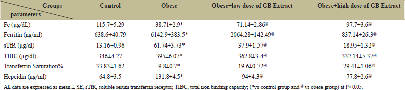 The present results attained that the studied obese rats had a highly significant decrement (P < 0.05) in serum Fe and transferrin saturation levels as well as highly significant increases in ferritin, TIBC, and sTfR levels compared to the normal control group [Table 4]. Furthermore, the hepcidin hormone in plasma was significantly increased in obese rats compared with control rats. Administration of low or high dose of GB significantly improves hepcidin hormone compared with obese rats.