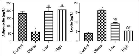 ![]() | Figure 3: Adiponectin and leptin for obese, obese + low dose of GB extract, and obese + high dose of GB extract groups in comparison with the control. Each bar represents the mean±SE. Statistical analysis was performed using one-way ANOVA followed by Tukey-Kramer multiple comparisons test for the respective time period. (*vs. control group, @vs. obese group, and #vs. low dose GB) at P < 0.05. [Click here to view] |