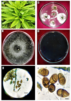 ![]() | Figure 2: Isolation, culture, and identification of L. theobromae. A. Lobelia nicotianifolia Roth ex Schult. B. Isolation of fungal endophytes C. Pure culture of L. theobromae, D. Reverse side of the colony. E and F. Conidia. Bars = 10 μm. [Click here to view] |