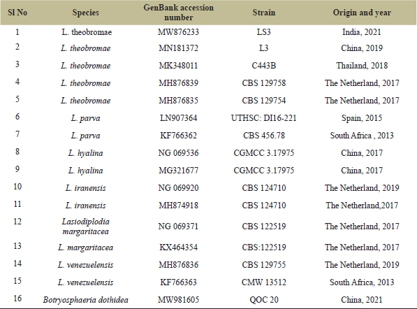 ![]() | Table 1: List of L. theobrame ITS species, origin, and GenBank accession numbers of the ITS sequences used in phylogenetic analysis. A newly generated sequence is in bold. [Click here to view] |
