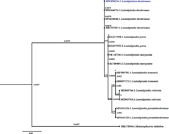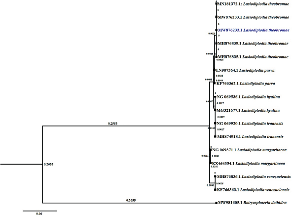 The phylogenetic evolutionary study was conducted separately for ITS and LSU sequences by NCBI-Blastn, MEGA-X, and Fig Tree software program. The phylogenetic investigation was using the Maximum Likelihood method and Tamura three-parameter model. The trees with the highest log-likelihood for ITS (−1,742.99) and LSU (−955.41) are shown. The difference in Gamma distribution rate between ITS [Type 5 (+G, parameter = 0.4515) and LSU Type 5 (+G, parameter=0.0575)] sites. There are 849 positions in ITS and 556 positions in the final dataset in LSU. In the evolutionary analysis of ITS (Fig. 3) and LSU (Fig. 4), Botryosphaeria dothidea was selected as the out group with GenBank accession numbers MK178544 and MW981605, respectively.