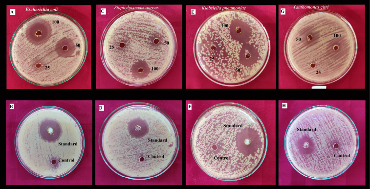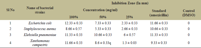 The present investigation revealed that that ethyl acetate extract of L. theobromae showed strong antibacterial activity against E. coli, S. aureus, K. pneumoniae, X. campestris compared to Amoxicillin (Fig. 5). Escherichia coli showed a high zone of inhibition among the tested bacterial strains (Table 3).