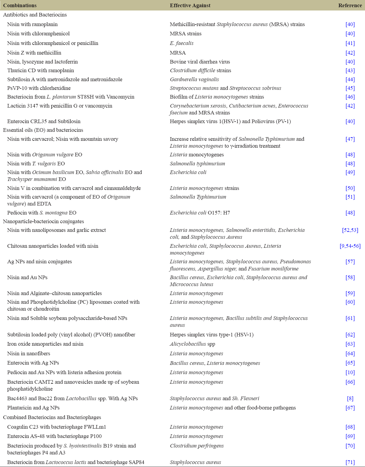 Scientists are continuously seeking viable methods to counteract various drawbacks of bacteriocins. One of the most common approaches is combinatorial therapy, in which bacteriocins are coupled with other bioactive chemicals including antibiotics, NPs, EOs, and bacteriophages to enhance their antibacterial properties [Figure 2]. Such combinations of bacteriocins have tremendous scope and potential to offer numerous benefits as they improve the antibacterial activity, stability, and solubility of bacteriocins while also protecting them from enzymatic degradation. Furthermore, one of the most significant advantages of these combinations is the reduced concentration of each component, which lowers their adverse effects. As a result, such combinations have a lot of potential in terms of expanding the usage of bacteriocins as antiviral and anticancer drugs. Numerous studies conducted using bacteriocins in combination with various bioactive compounds and proved to be effective against a variety of infections have been summarized in Table 2 [40-71].