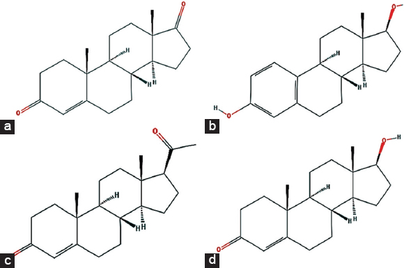 | Figure 1: Structure of studied steroid hormones – (a) androgen, (b) estrogen, (c) progesterone, and (d) testosterone. [Click here to view] |
