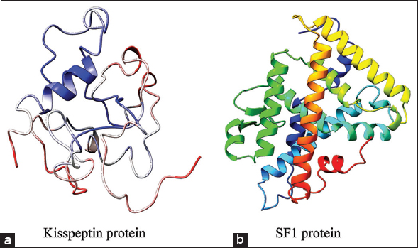 | Figure 2: The modeled tertiary structure of proteins – (a) kisspeptin, and (b) SF1 [Click here to view] |
