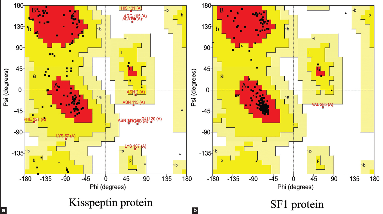 | Figure 3: Ramachandran plot for modeled protein structures of (a) kisspeptin and (b) SF1. [Click here to view] |
