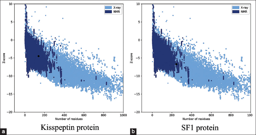 | Figure 4: ProSA model quality score graph for modeled protein structures – (a) kisspeptin (Z-score= −4.46) and (b) SF1 (Z-score= −6.69). [Click here to view] |