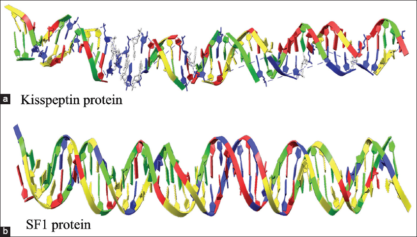The DNA promoter regions for gene Kiss1 and DAX1 were identified using machine learning approaches with a promoter range of 3175–3225 and 1514–1564, respectively [Table 2]. The tertiary structures for both the gene promoter regions were predicted using the “model.it” web server with a straight B-DNA parameter setup and were used for further molecular docking studies [Figure 5].