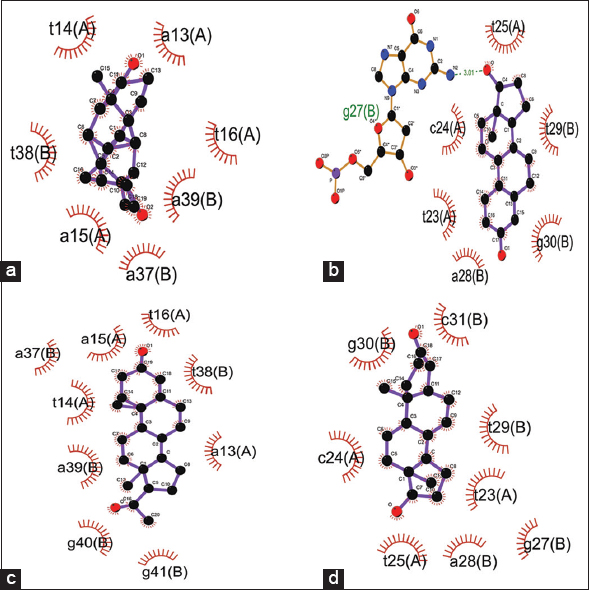 | Figure 6: Docking interactions of the KISS1 gene promoter region with steroid hormones – (a) androgen, (b) estrogen, (c) progesterone, and (d) testosterone. [Click here to view] |