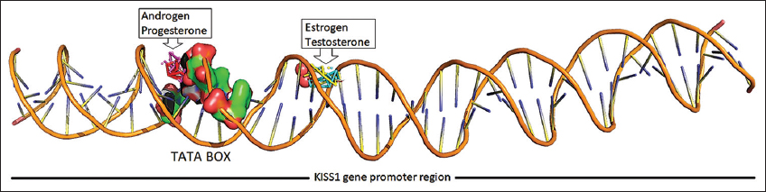 | Figure 7: Steroid hormones binding over promoter region of KISS1 gene. [Click here to view] |