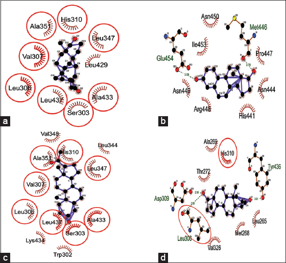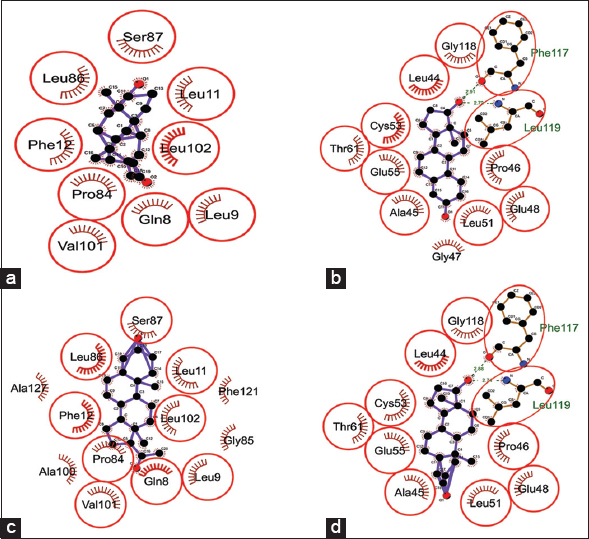 | Figure 8: Dock interactions of kisspeptin protein with steroid hormones – (a) androgen, (b) estrogen, (c) progesterone, and (d) testosterone. [Click here to view] |
