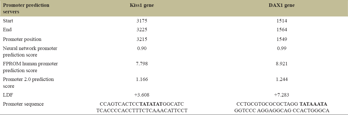 | Promoter prediction servers | Kiss1 gene | DAX1 gene |