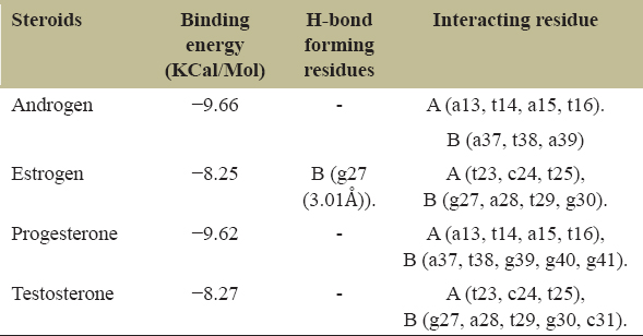 Table 3: Binding energy and interacting residues of Kiss1 gene promoter region when docked against studied steroid hormones (androgen, estrogen, progesterone, and testosterone).