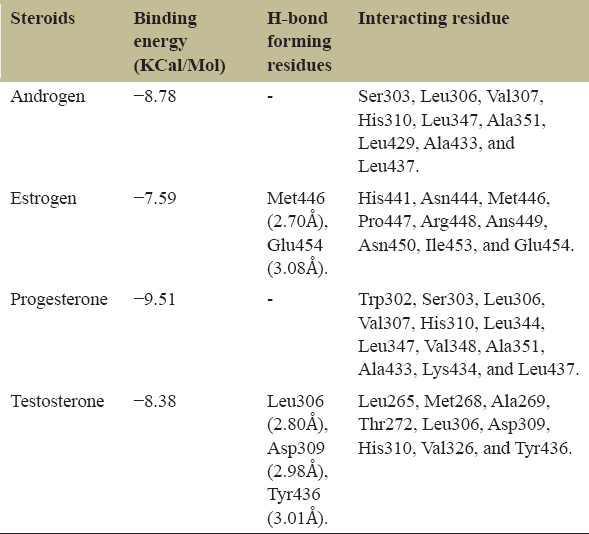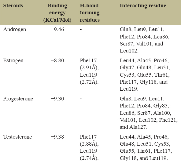 | Steroids | Binding energy (KCal/Mol) | H-bond forming residues | Interacting residue |