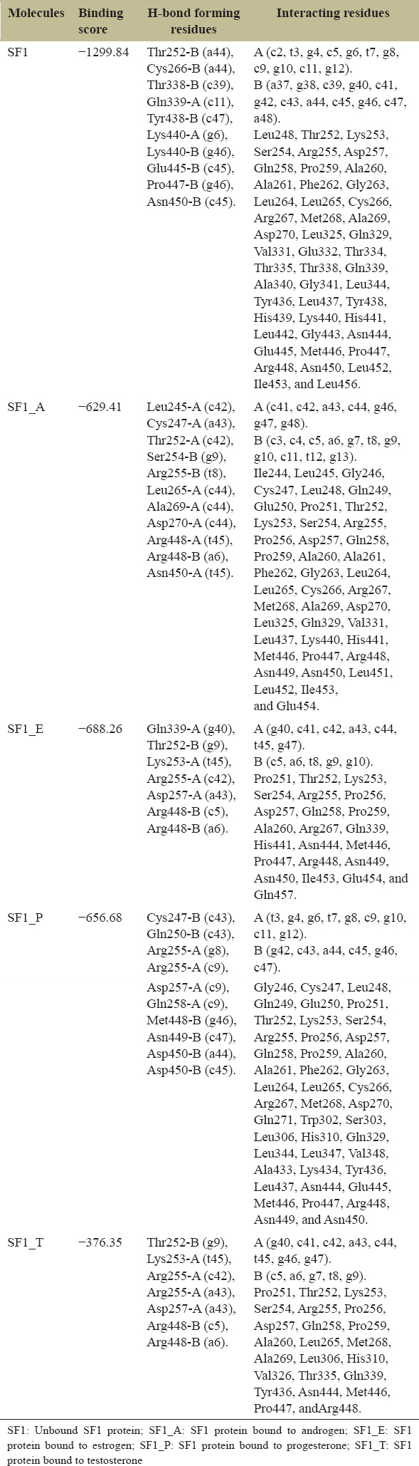 Table 5: Binding energy and interacting residues of SF1 protein when docked against studied steroid hormones (androgen, estrogen, progesterone, and testosterone).