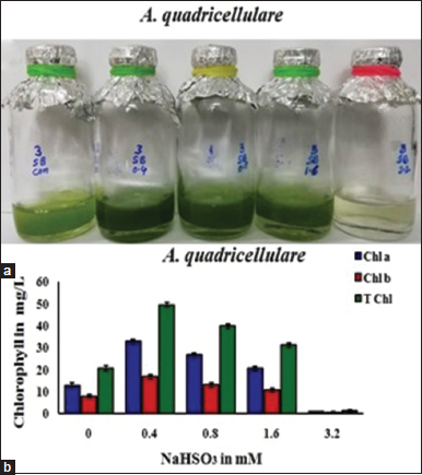 ![]() | Figure 3: Effect of NaHSO3 on growth (a) and chlorophyll accumulation and (b) in Asterarcys quadricellulare (Chl a-chlorophyll a, Chl b-chlorophyll b, and T Chl-Total chlorophylls). [Click here to view] |