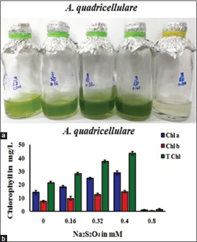 ![]() | Figure 4: Effect of Na2S2O4 on growth (a) and chlorophyll accumulation and (b) in Asterarcys quadricellulare (Chl a-chlorophyll a, Chl b-chlorophyll b, and T Chl-Total chlorophylls). [Click here to view] |